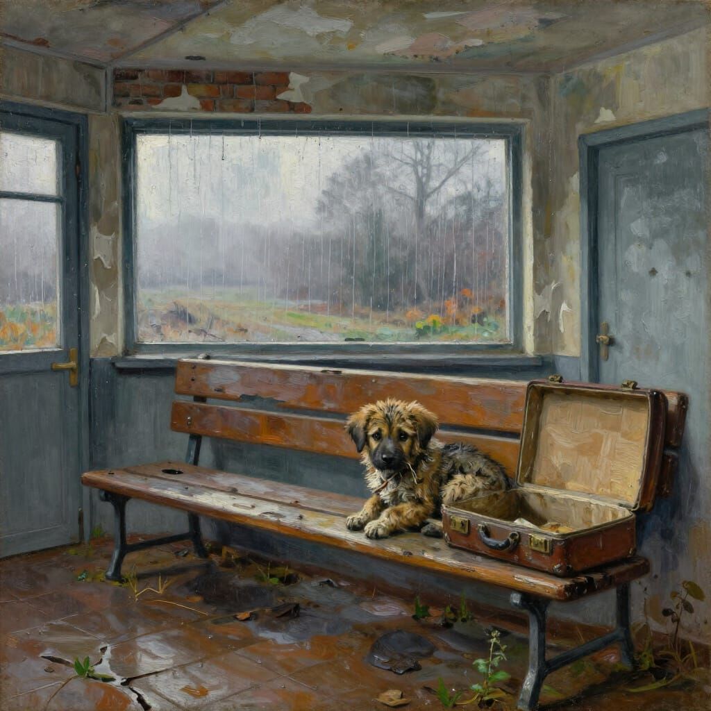 This painting shows a tiny, muddy stray puppy shivering on a decaying bench in a desolate waiting room. The art style is Neo-Impressionist and Expressionist with thick, textured paint.