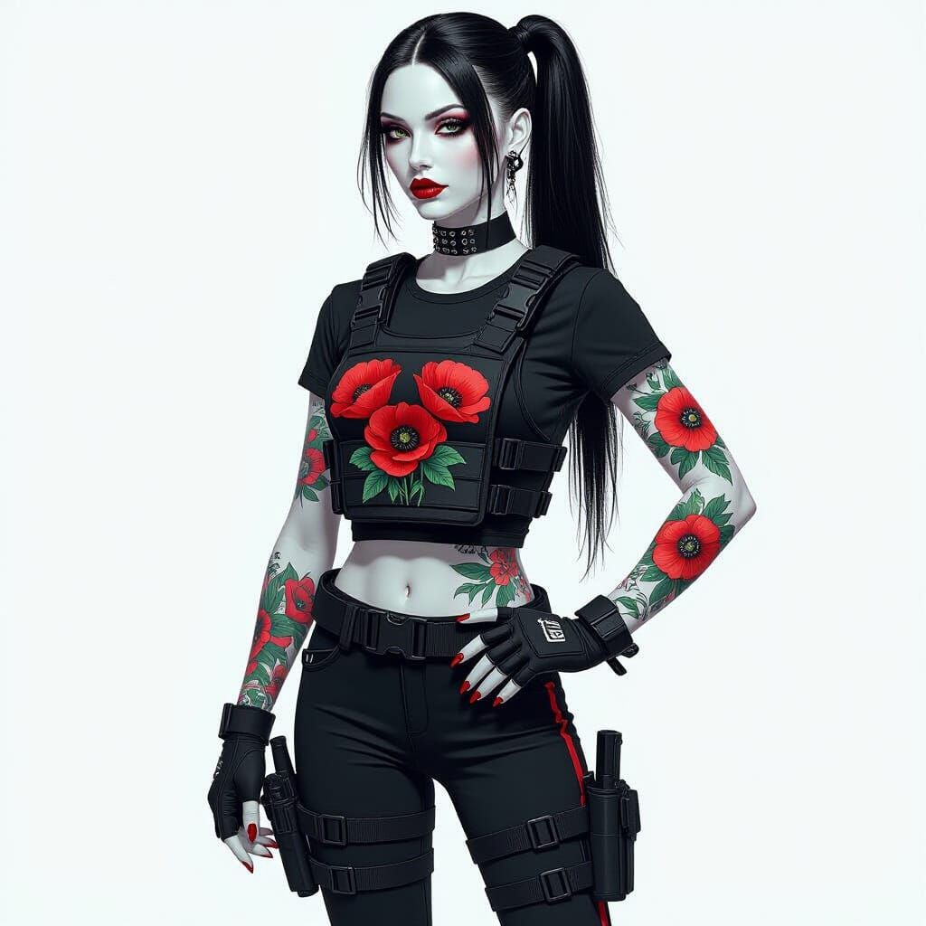 A captivating image of a slender, gothic mannequin puppet with poppy tattoos and black tactical gear. The artwork showcases a dark noir aesthetic with futuristic industrial elements and vibrant gothic touches.