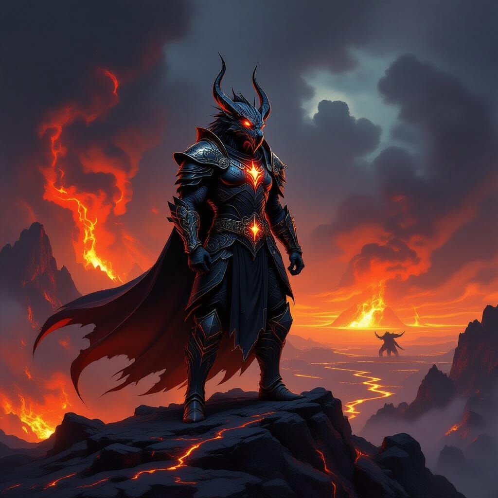 This hyperdetailed dark fantasy concept art features a dragonborn warrior in obsidian armor on a volcanic peak. Dramatic lighting and a fiery color palette enhance the intense atmosphere.