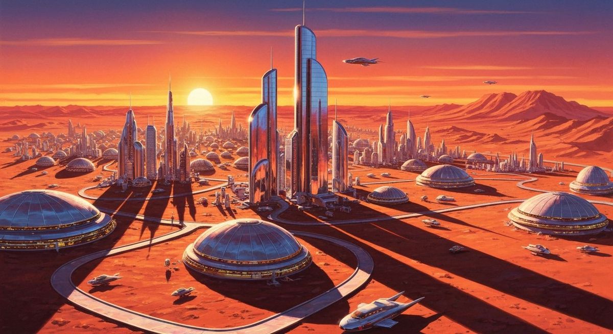 A vibrant retrofuturistic illustration of a futuristic Martian city at sunset. Features towering skyscrapers, domed habitats, and aerial vehicles in a bold, optimistic style with warm colors.