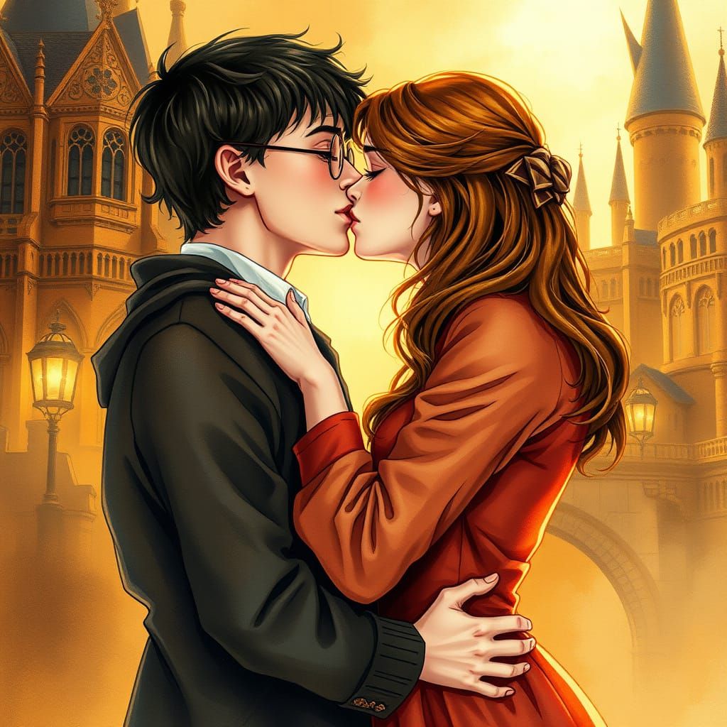 A warm, golden image shows Harry Potter and Hermione Granger in a tender kiss against the backdrop of Hogwarts. The romantic scene features intricate details in a cinematic style.