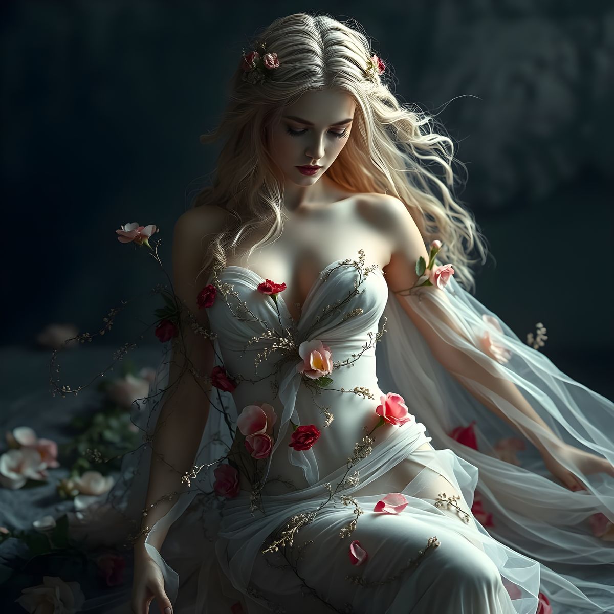 This image is a hyperrealistic depiction of a goddess in a beautiful floral dress, shot with meticulous attention to detail and high contrast.