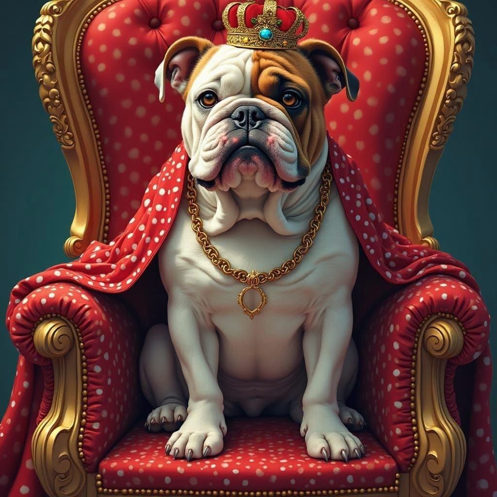 This image depicts a comically serious English bulldog sitting regally on a lavish throne, adorned with velvet cushions and gemstones, blending comic book art with opulent luxury.