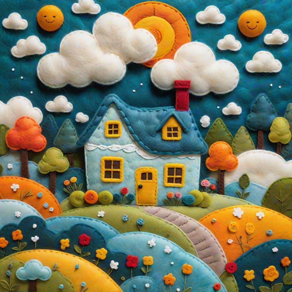 This image shows a quaint cottage nestled in a felt landscape. The scene is rendered in a whimsical felt art style, complete with fabric textures, a button sun, and soft, warm lighting.