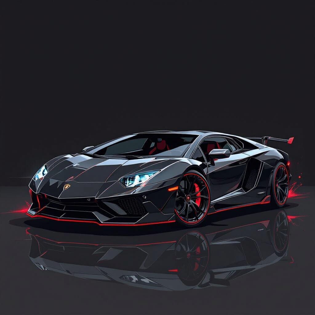 A dynamic, cel-shaded illustration of a black Lamborghini Aventador featuring sharp red details and vibrant highlights against a dark background, rendered with energetic outlines.