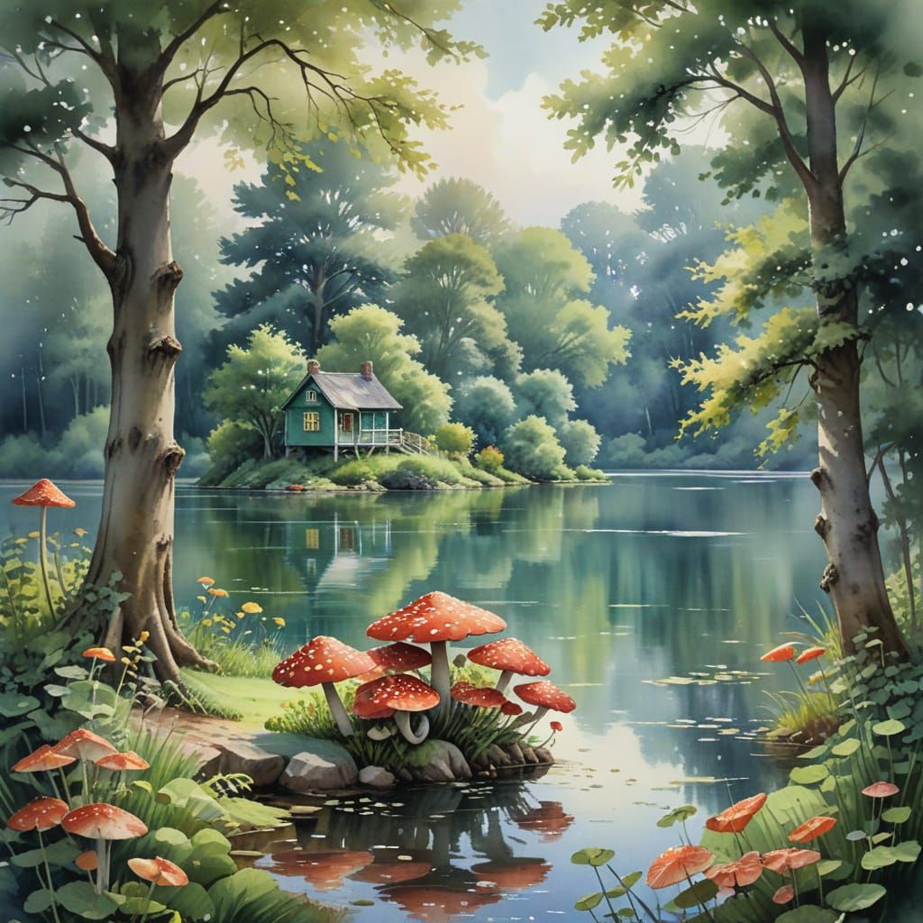 watercolor painting depicts vibrant summer landscape centered around serene lake. water reflects hues of surrounding environment, with small mushroom house nestled on edge of lake. large, multi-trunked tree stands, its branches adorned with bright leaves. Lush foliage in shades green borders lake. sky ...