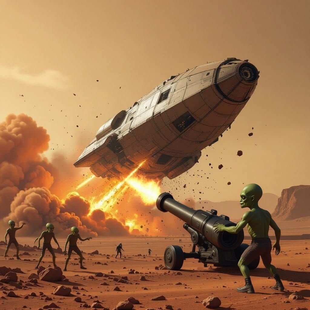 Easily generate dramatic scenes of spaceships crashing and aliens fleeing with our free AI image creator.