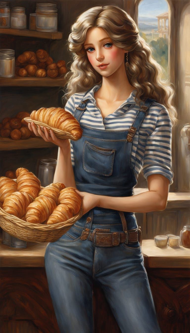This image depicts a serene scene of Barbie, dressed in casual attire, holding a freshly baked croissant, set against a backdrop of soft, diffused light, reminiscent of the Pre-Raphaelite style.