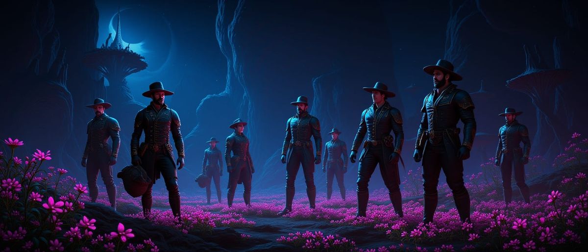 A cinematic image shows settlers in steampunk clothing amid glowing plants on an alien world. The scene is reminiscent of surrealist art, rendered with oil painting textures and high-contrast HDR lighting.