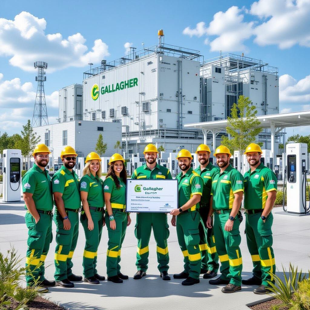 This image shows a diverse team from Gallagher Electric at the Long Island Power Plant, showcasing a massive battery storage facility. The scene includes EV stations, LED lighting, greenery, and sustainable technology in a futuristic setting.