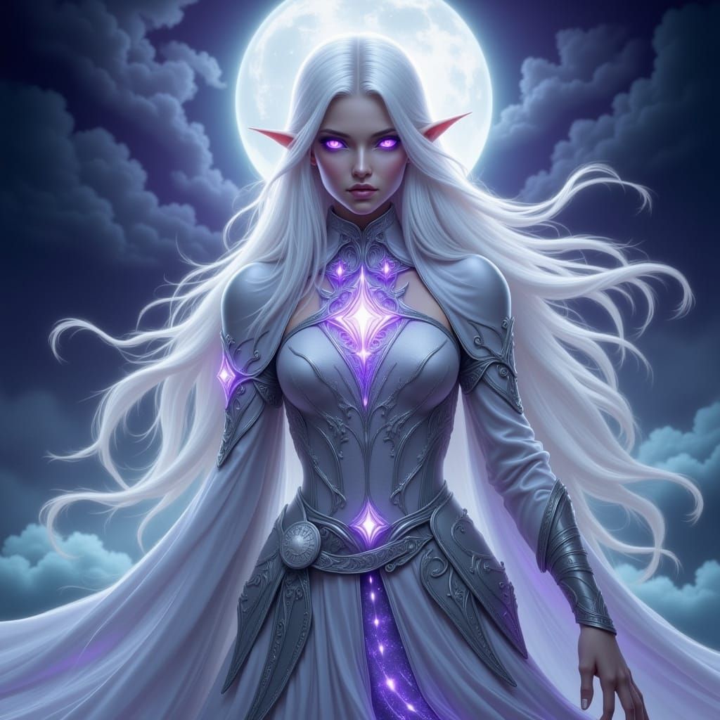This image shows a majestic pale elf warrior in intricate silver armor and violet gemstones, with long silver hair and piercing violet eyes, set against a mystical backdrop of swirling mist and ethereal light, evoking the fantastical worlds of high-fantasy concept art.