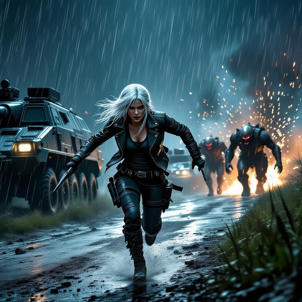 This image shows a white-haired huntress fleeing an ambush. Hulking abominations emerge from a transporter amidst sparks, smoke, and heavy rain, in a gritty, high-contrast, cinematic style.