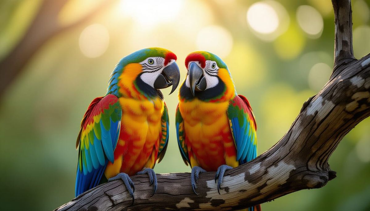 This image captures two colorful macaws in a close-up view, perched together on a tree branch. Rendered with cinematic lighting and film grain for a dramatic, atmospheric effect.
