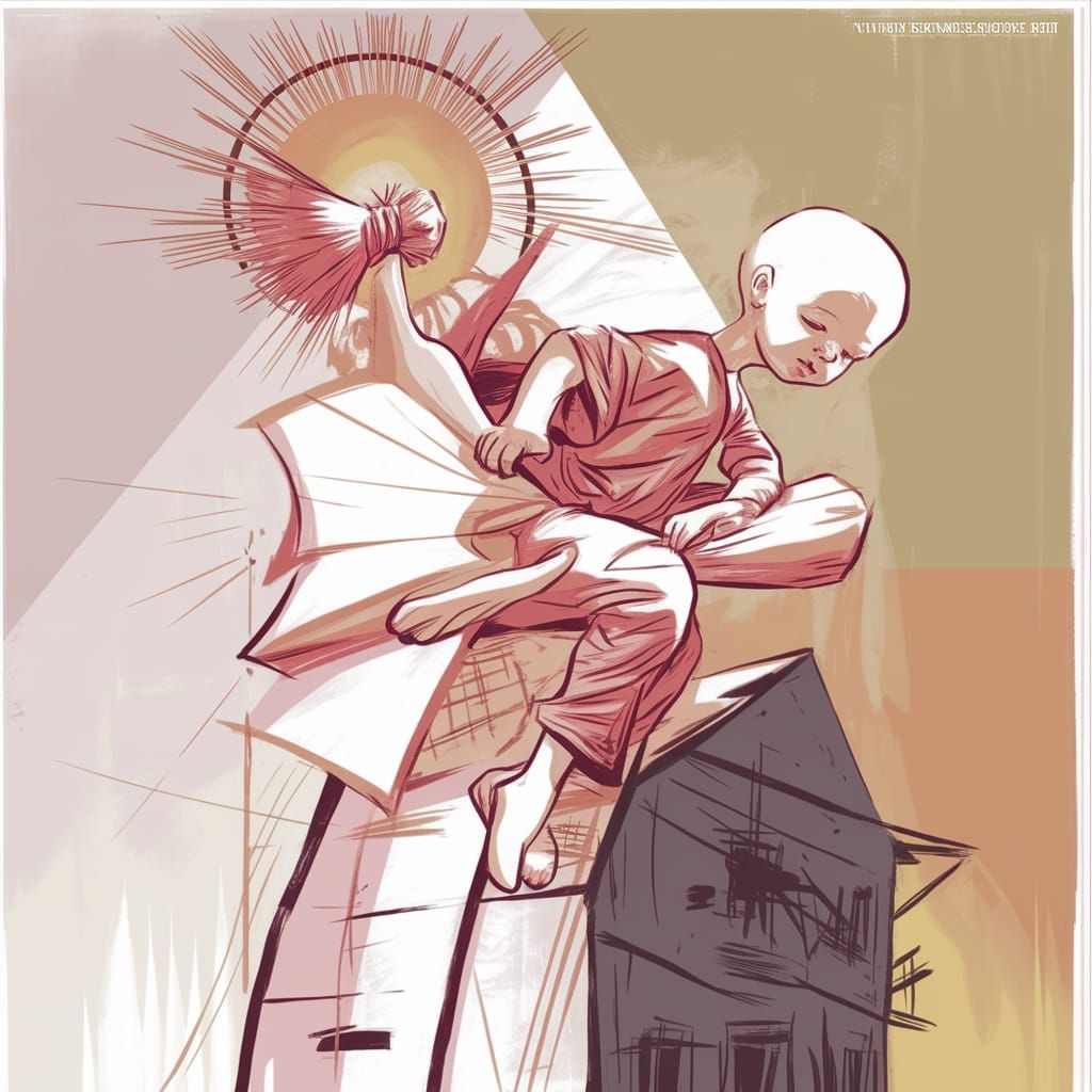 This vibrant propaganda poster features a child riding a broomstick above a shantytown, bathed in warm golden light, with art deco elements and split-complementary colors creating a surreal and hauntingly beautiful scene.