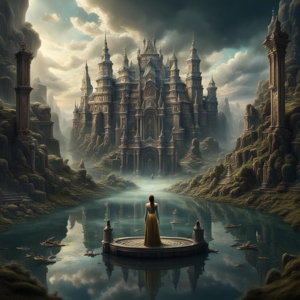 This image shows an epic and dramatic digital painting of a woman in an atmospheric lake labyrinth. The artwork is intricately detailed and maximalist in style.