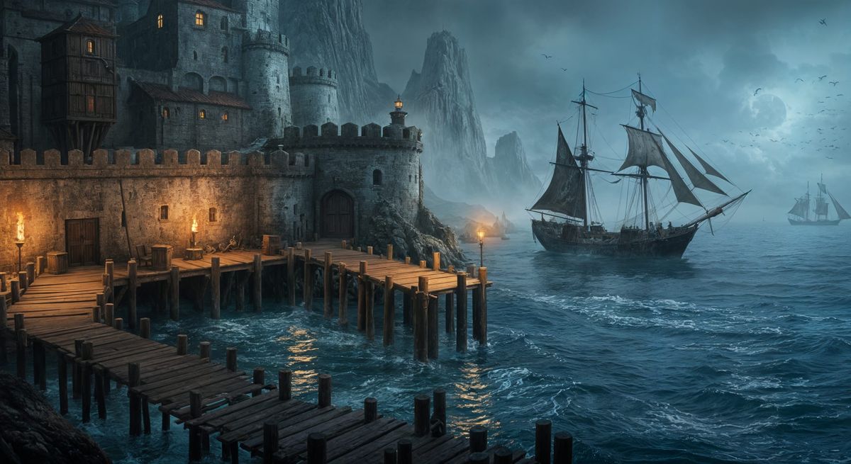 A mist-shrouded medieval pirate fort rises from the rocky coast, surrounded by wooden sailing ships in the moonlit harbor, with the soft glow of torches and lanterns casting a mystical aura.