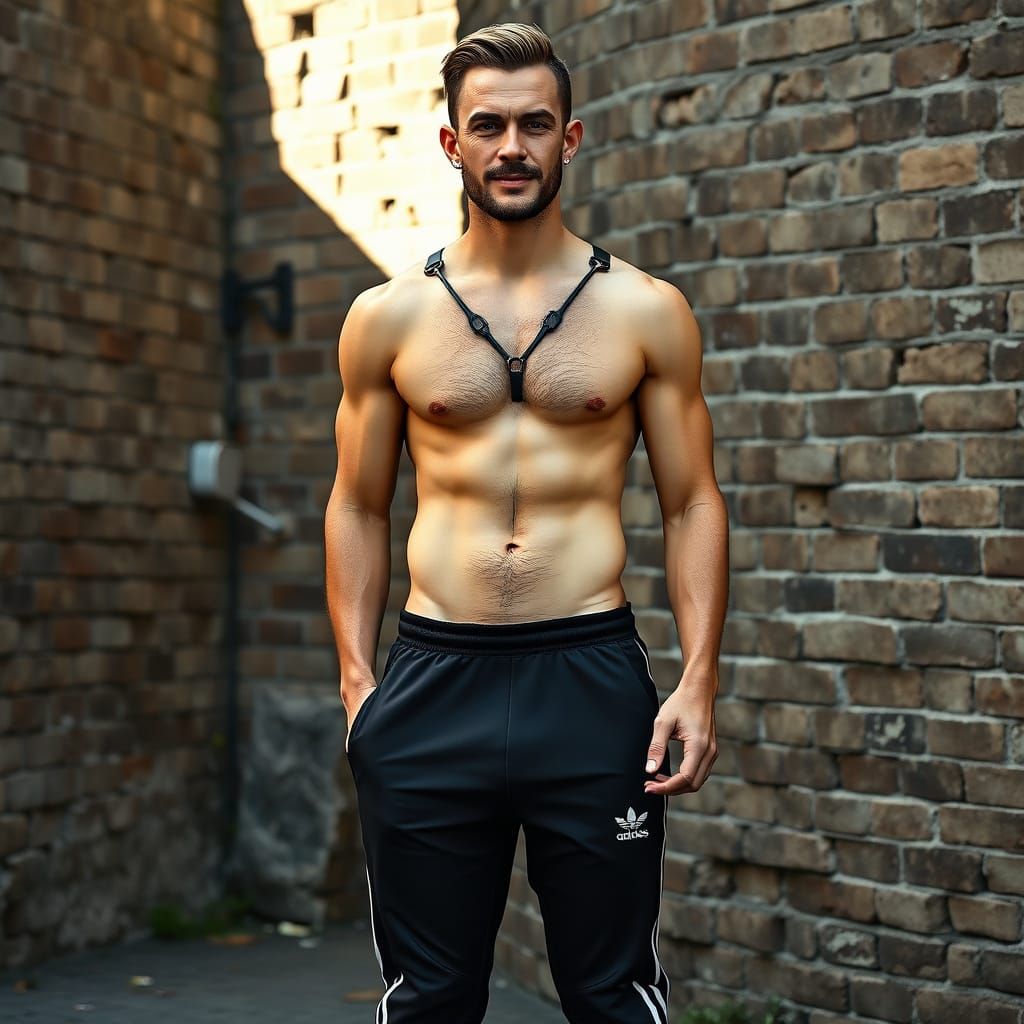 This image shows a photorealistic portrait of a tall, athletic European man in his mid-30s. He stands confidently against an old brick wall, displaying a relaxed and approachable demeanor.