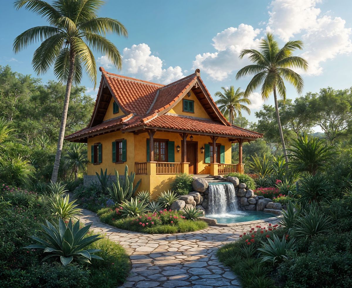 A vivid digital painting of a traditional Aruban house in a lush tropical setting. The artwork showcases vibrant Caribbean colors and a unique waterfall feature, rendered as detailed digital art.