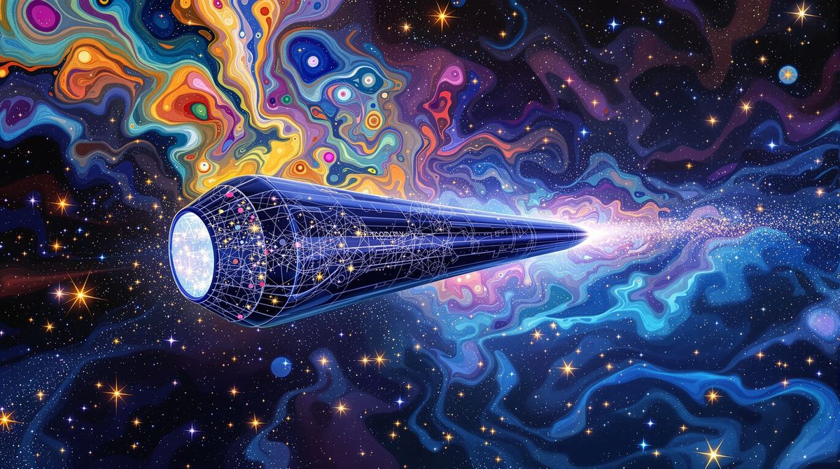 A sleek, obsidian interstellar craft with internal bioluminescent light navigates a nebula of swirling, psychedelic colors and star-shaped objects, featuring sparkling exhaust. Inspired by Klimt's style.