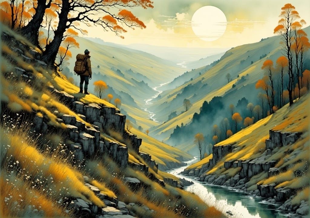 A lone hiker gazes over a river valley from a rocky outcrop. The scene is rendered with expressive brushstrokes and intricate textures in an impressionistic style.