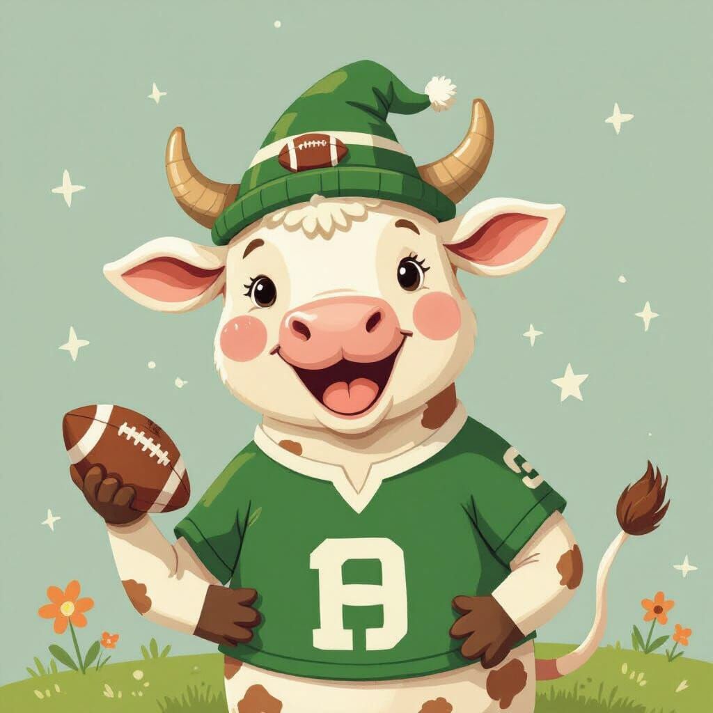 A charming illustration of a laughing cow in a football-themed outfit. The udders are shaped like footballs, rendered in a whimsical style inspired by classic children's book illustrators.
