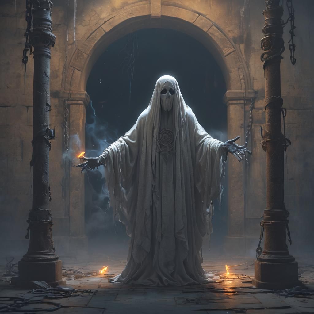 A spectral figure stands in the heart of a decaying prison, its shackles shattered. The scene, bathed in blues and oranges, features a haunting ambiance with ethereal mist and dramatic shadows.