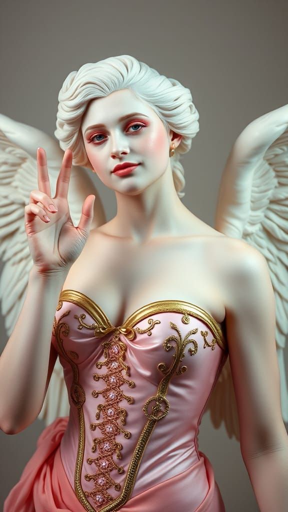 This image shows an androgynous albino angel in a gold and pink corset. The angel is making a beckoning gesture in a Dadaism style, with pastel colors and airbrush makeup.