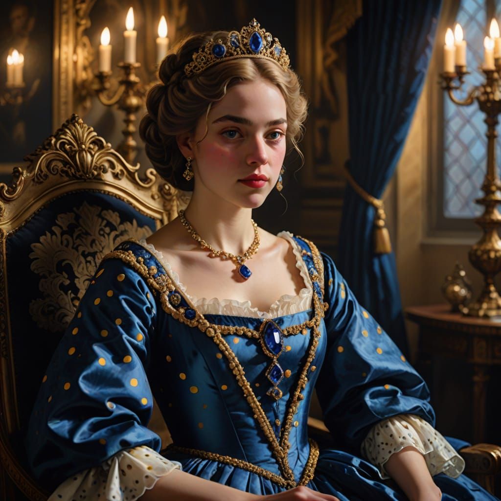 This image shows a princess in a throne room, wearing a shimmering sapphire gown with polka dots. The oil painting style, warm candlelight, and golden light evoke the Dutch Golden Age.