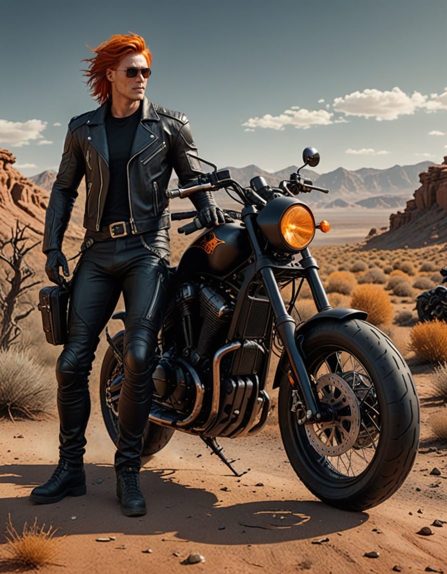 A long shot of a man with dark orange hair in motorcycle gear. He poses in a barren landscape with a customized motorcycle in a fantasy concept art style.