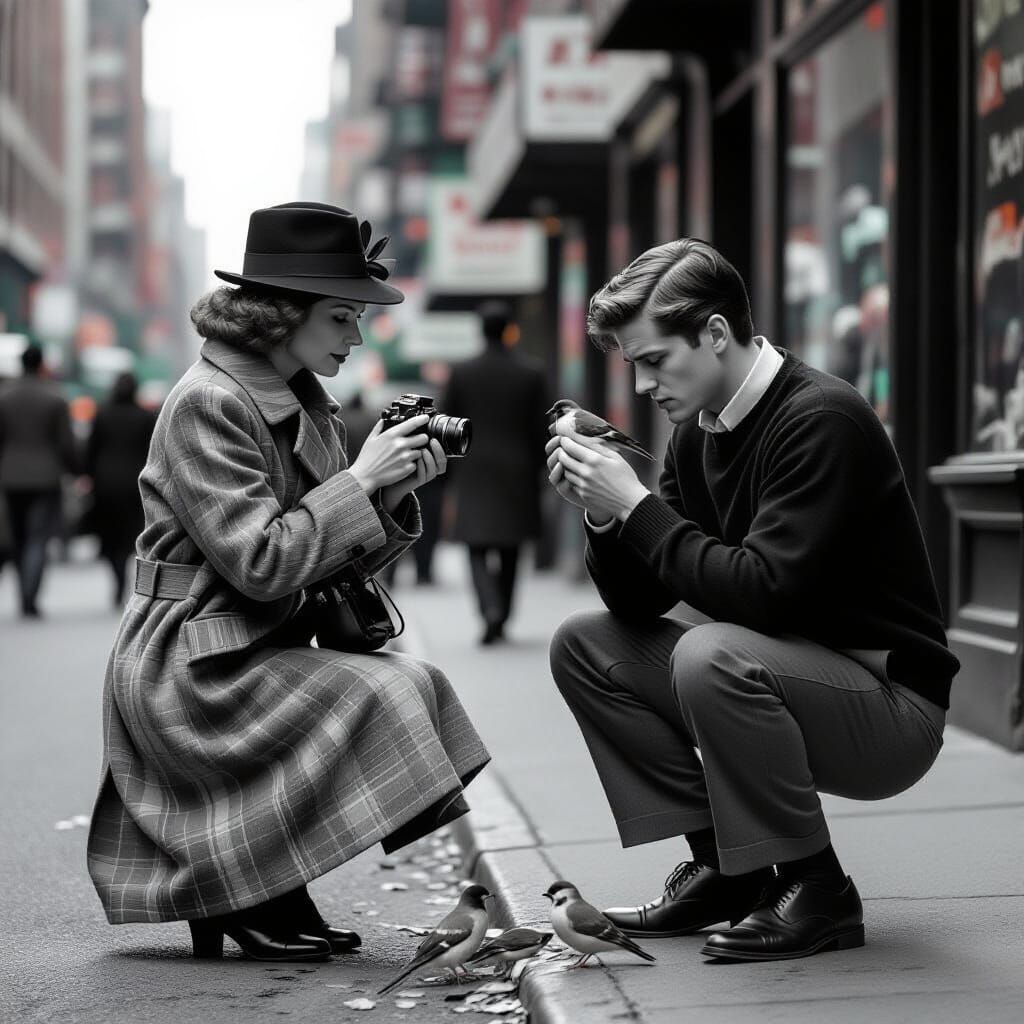 This image shows a woman in vintage attire photographing a man feeding birds on a busy New York street. The black and white image captures a gritty, high-contrast street photography style.