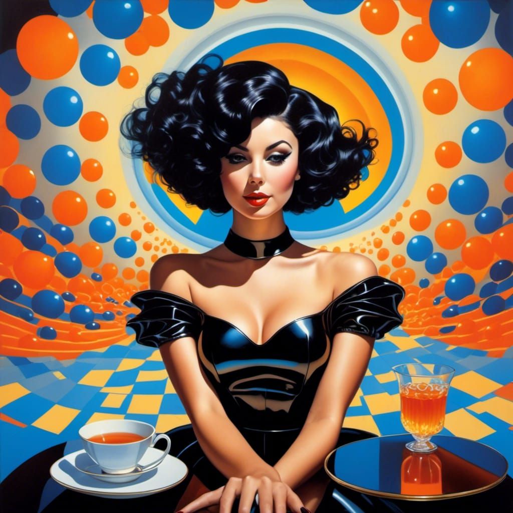 This image shows a woman with curly black hair wearing a shiny black latex dress. She is sitting on a terrace drinking tea, set against a vibrant radial gradient background in black, orange, and blue, with an illustration art style.