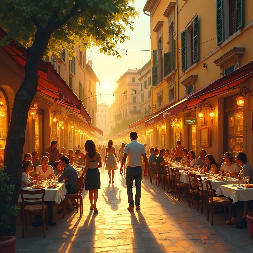 This image shows a vibrant Italian street scene at sunset, with people dining at outdoor tables and enjoying good food and wine. The painting combines loose brushstrokes with vivid colors, blending the style of French impressionism with Italian romanticism and whimsical touches.