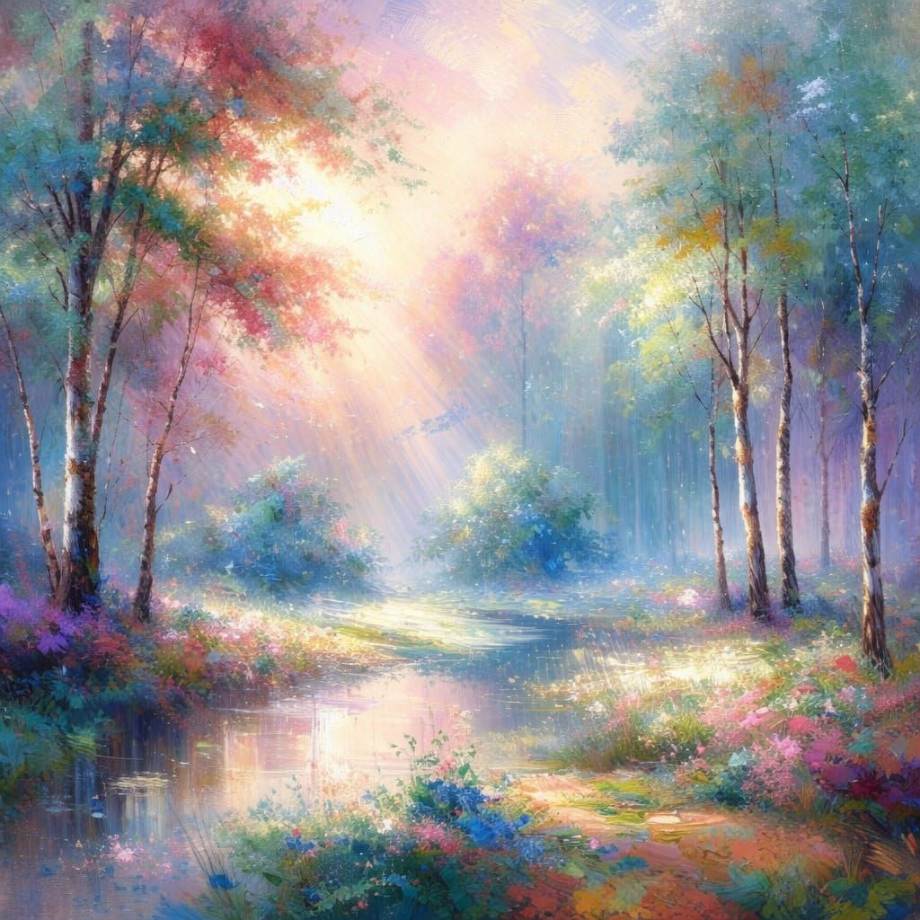 This image showcases a mystical morning scene with intricate details. Rendered in a gouache and watercolor style with thick, textured brush strokes, it features complementary colors and fine details.