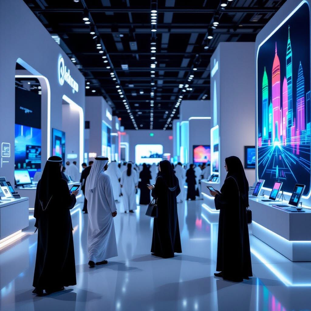 A tech exhibition featuring people in Islamic attire amidst modern technology. The screens display national colors in a futuristic style with minimalist and neon aesthetics.