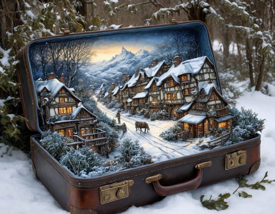 This enchanting watercolor painting depicts a serene snowy village nestled inside a vintage suitcase, showcasing intricate details and delicate features.