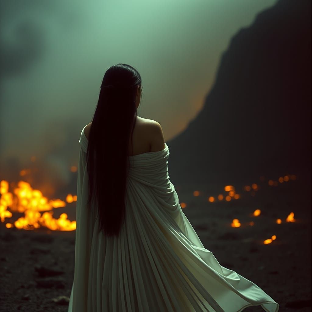 This haunting portrait of a woman in a flowing white gown captures the eerie atmosphere of a desolate, apocalyptic world consumed by flames. Shot in a cinematic style reminiscent of film noir, with deep shadows and rich color grading, evoking a sense of foreboding and unease.