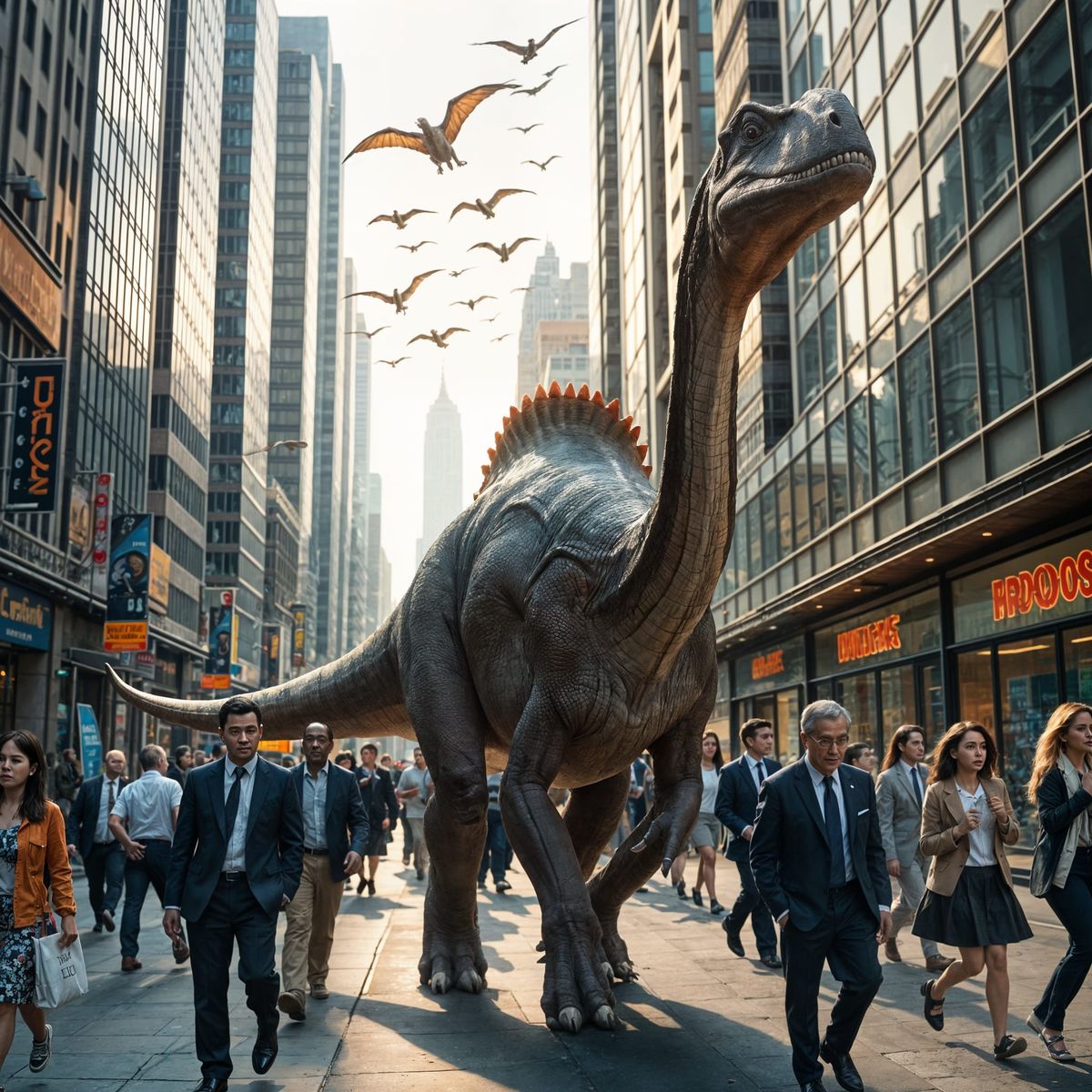 This image shows a modern city where dinosaurs and humans coexist. A massive Apatosaur walks down a busy street, photographed with a shallow depth of field to highlight its scales amidst the urban landscape.