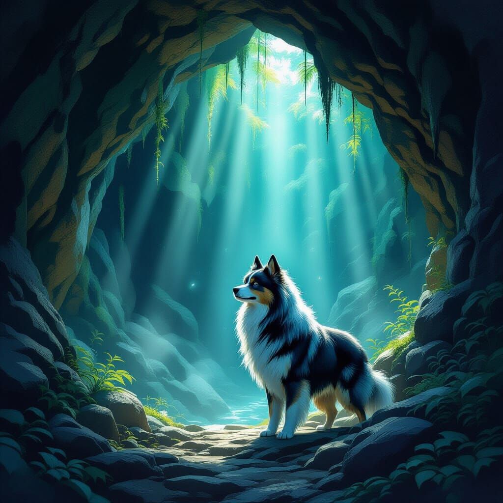 This image shows a dog with glowing fur guarding a hidden cave with luminous, atmospheric lighting. The digital painting features intricate nature-inspired carvings and a serene fantasy art style.