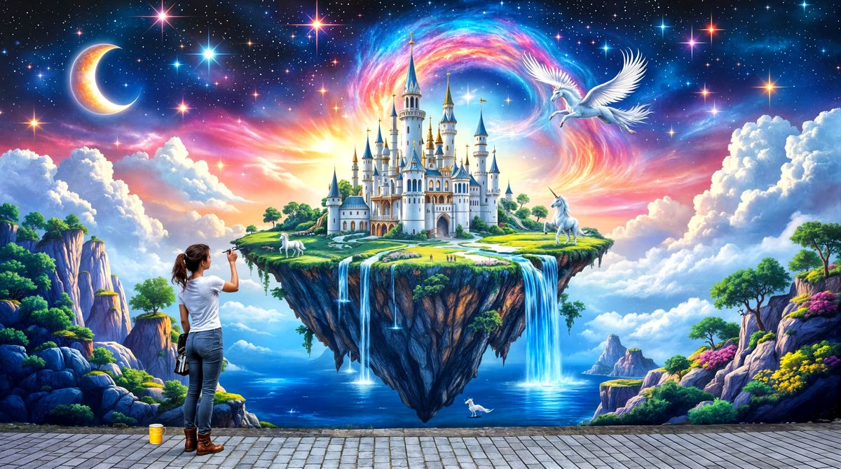 This image shows a woman creating airbrush art of a fantasy landscape on a city wall. The vibrant scene includes a floating island with a waterfall, a castle, a dragon, and a unicorn set against a colorful galaxy.