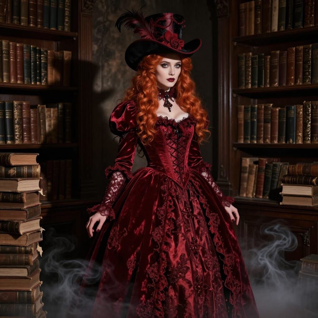 A striking redhead woman in a deep crimson gothic gown and feathered hat, set in a dimly lit ancient library. Dramatic lighting and ethereal mist create a mysterious dark fantasy atmosphere.
