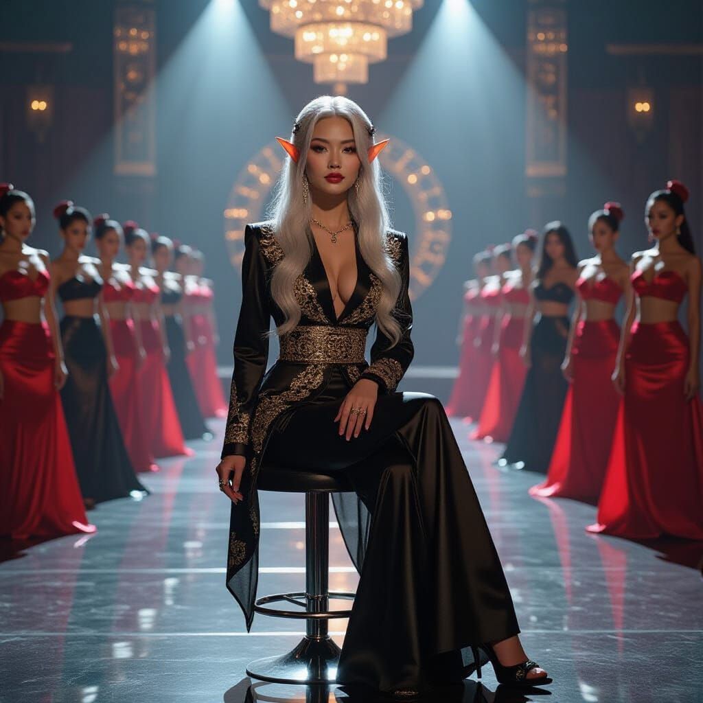 A hyperrealistic image of a mystical Asian elf in gold and black satin, sitting at a bar. The scene features dancers on stage, captured with cinematic lighting and vivid colors, evoking allure and mystery.