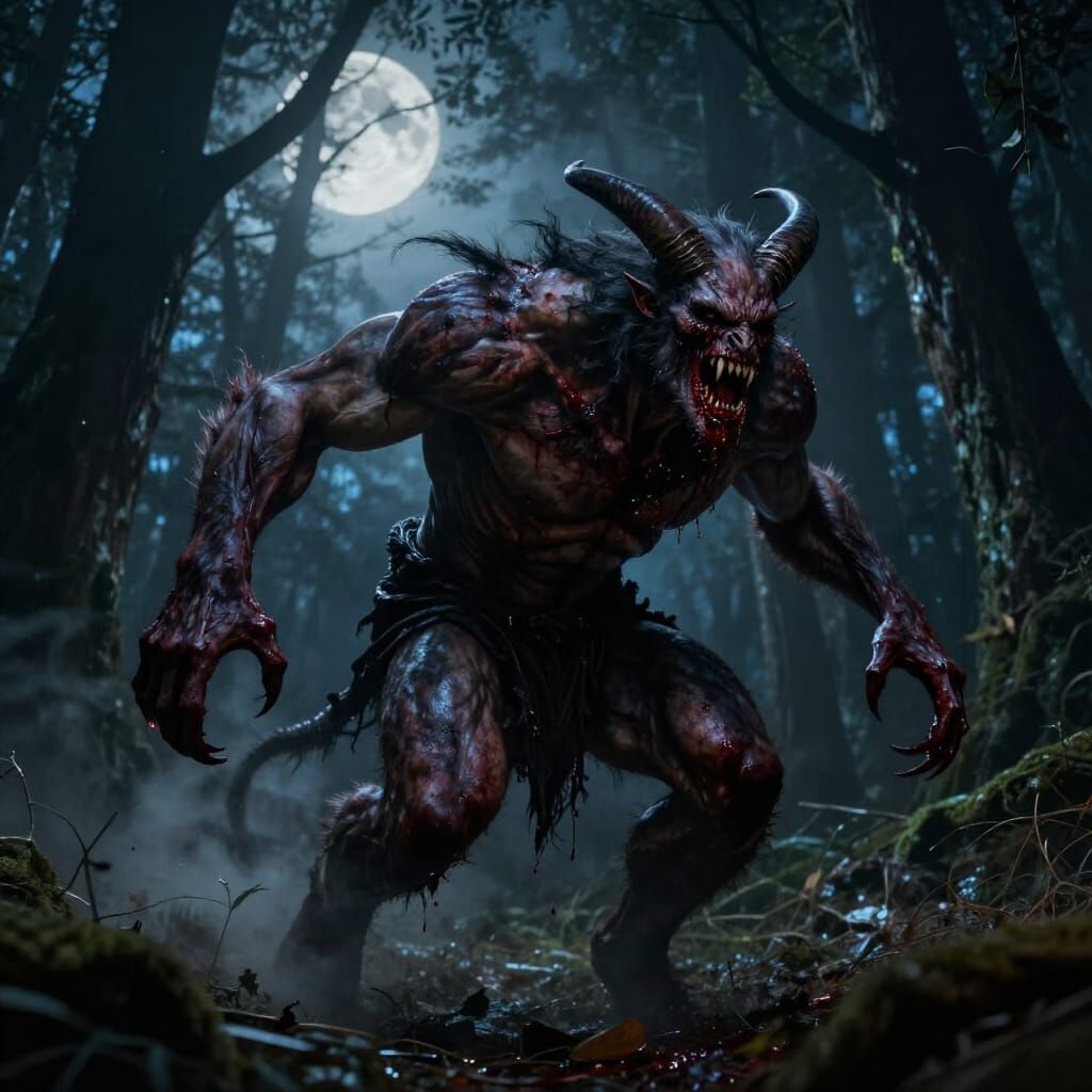 This image depicts a powerful lycanthrope with bloodied teeth and claws, running through a dark forest under the moonlight. Rendered in a hyperrealistic dark fantasy style with dramatic lighting.