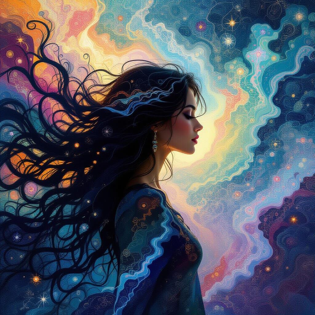 This striking image features a woman's silhouette filled with a layered portrait, her hair transforming into fractal streams of radiant, dreamlike colors in a painterly style.