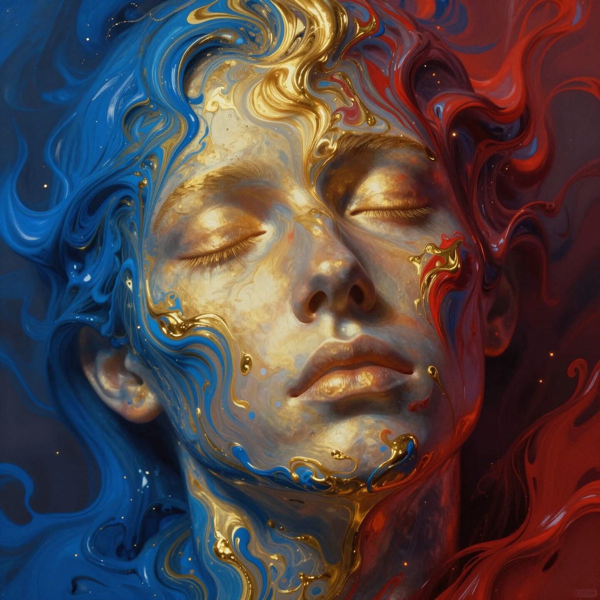 This image shows a human face dissolving into a fluid, dreamlike blend of cerulean, gold, and crimson paint. Inspired by surrealism and abstract expressionism, with dramatic, atmospheric lighting.