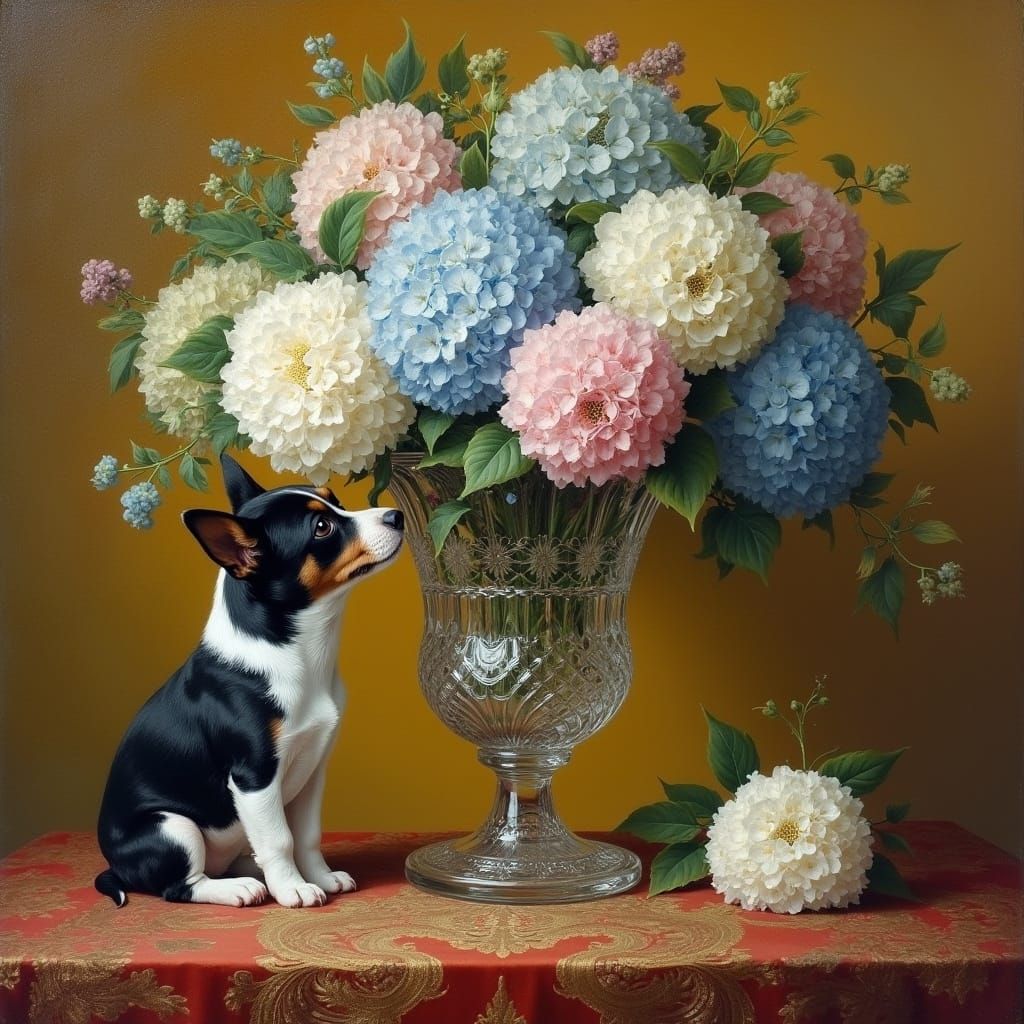 This image shows a lavish still life featuring an ornate vase filled with hydrangeas against a warm, golden background, reminiscent of a 19th-century Dutch Master's style, with thick brushstrokes and rich textures