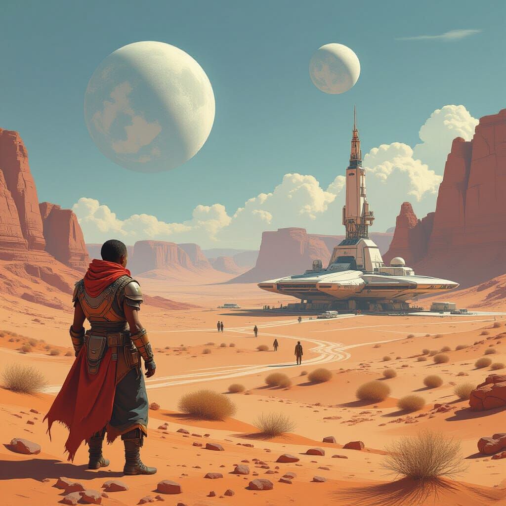 This image depicts a desert planet, Lijuter, in the Outer Rim Territories. It shows the Houk species in tribal attire near a research station in a futuristic yet rustic aesthetic.