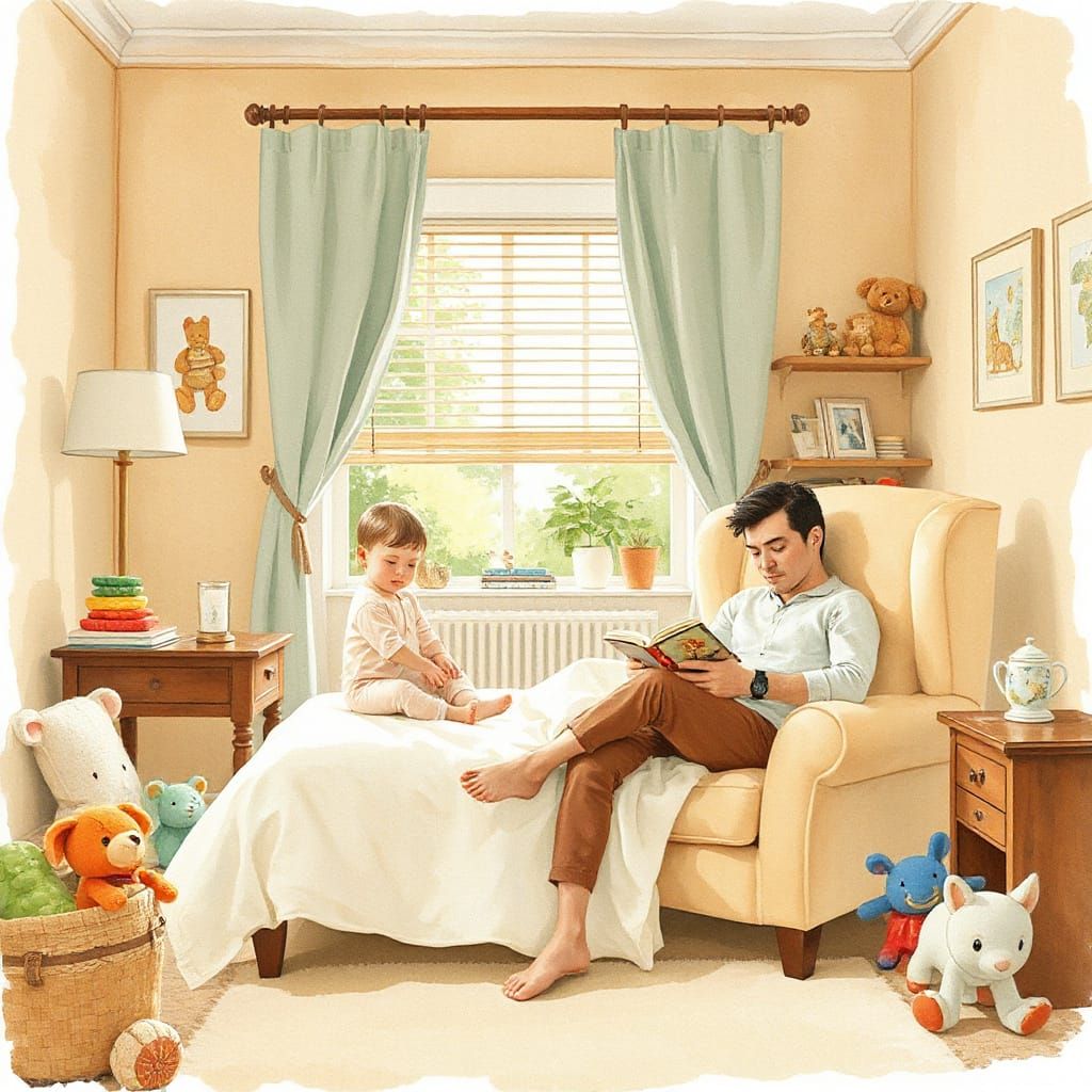 This image shows a cozy child's bedroom with warm beige walls. A young child sits awake in bed while their dad sits asleep in an armchair, book in lap. Rendered in a serene watercolor style.