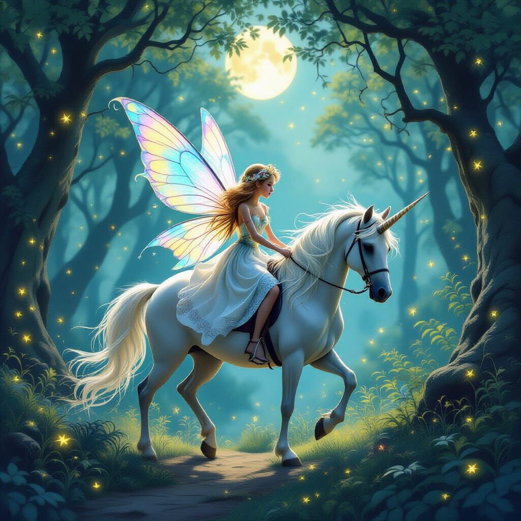 This image depicts a fairy girl with shimmering wings on a unicorn in a moonlit, enchanted forest. Glimmering fireflies and dappled shadows create a magical glow, rendered in a painterly Art Nouveau style.