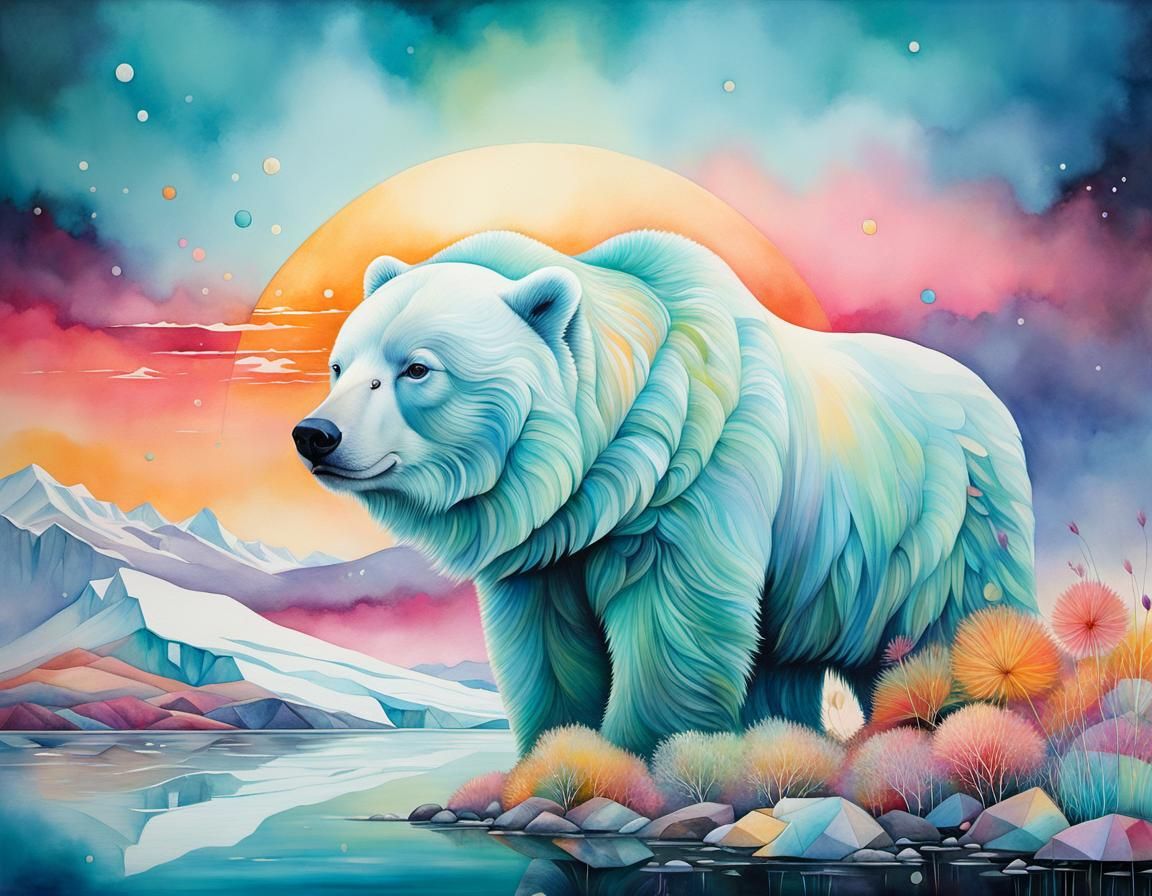 This image shows a minimalist and whimsical pastel arctic sunrise. The artwork features intricate details and a cubist background, evoking a sense of magic and beauty.
