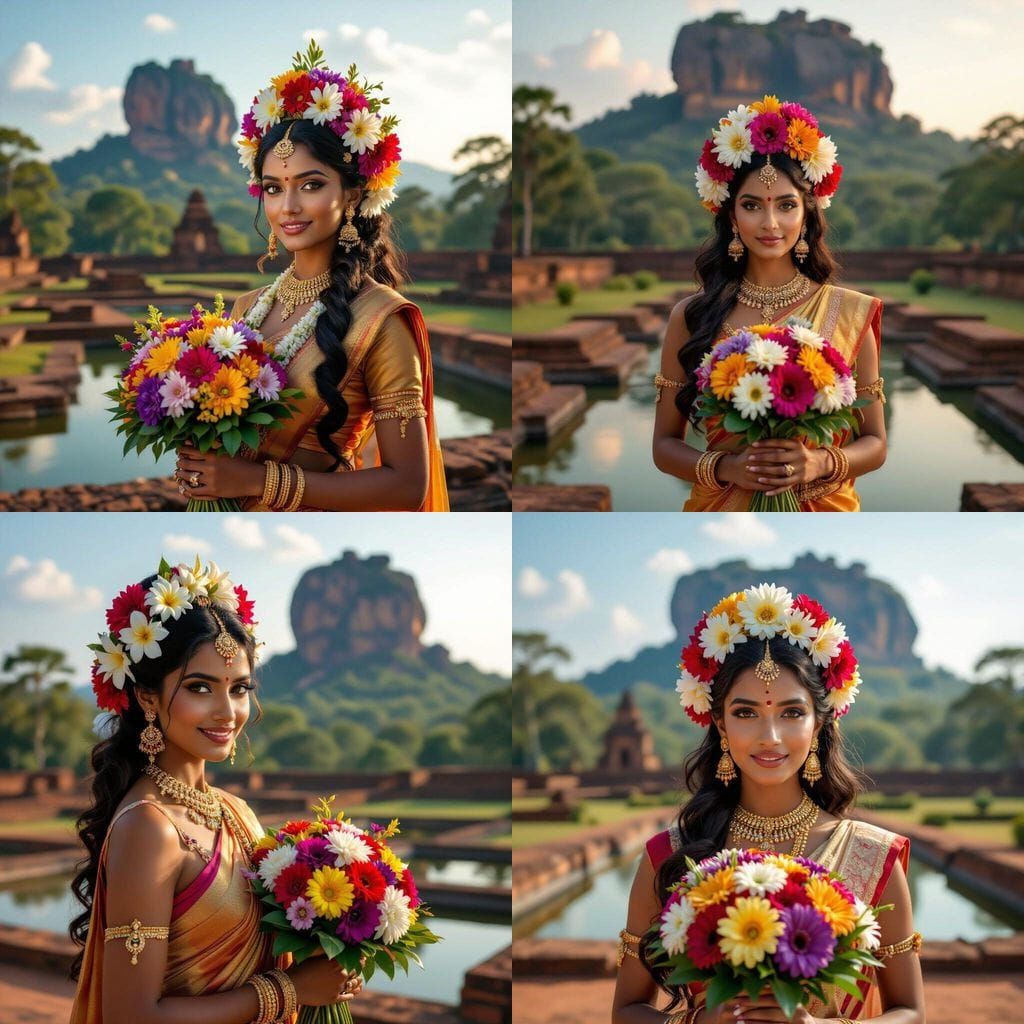 This photorealistic image features a Sri Lankan woman adorned with a floral headdress and traditional jewelry, holding flowers. She stands before the Sigiriya water gardens with the rock fortress in the background, captured in soft, artistic light.